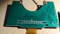 | | Auf der Platine befinden sich dann ca. 30 verzinnte Leiterbahnen in einer Reihe, auf dem Display sind im gleichen Raster die Leiterbahnen hauchdünn aufgedampft. |