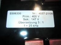Aufschrift: Prim: 400V Sek: 147V, Übersetzung 3:1, f= 25 khz,