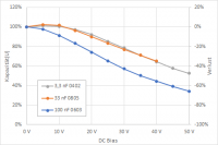 Als Nächstes sollte ich ein paar bekannte X7R, C0G und Y5V MLCCs mit bekannter Nennspannung betrachten.