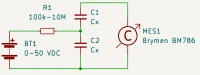 Fürs erste hab ich einen ganz einfachen Aufbau mit zwei in Reihe geschalteten Kondensatoren und einem Kapazitäts-DMM gewählt: