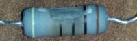 Der Widerstand hat die Kombination Braun Schwarz Schwarz Schwarz (teilweise Braun, können aber Kohlstellen sein) und dann Gelb. Zwischen dem letzten Schwarz (oder evtl. braun) und Gelb ist ein enormer Abstand.