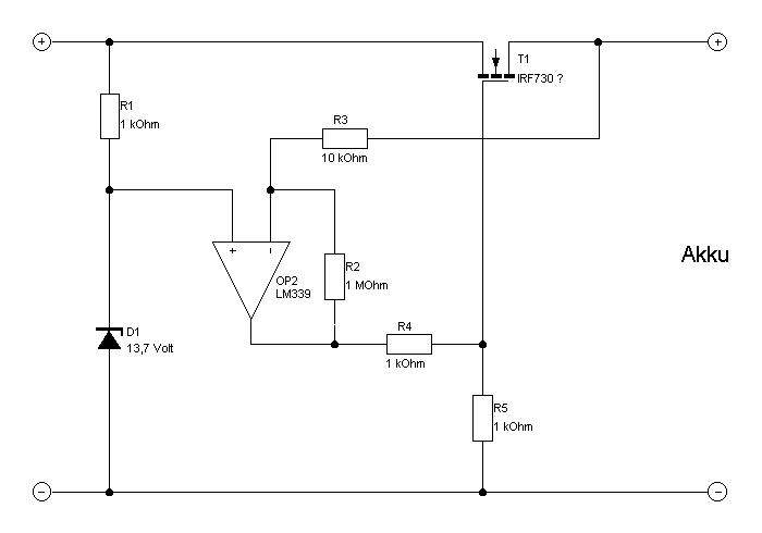 Vorgaben? Dachte ich, das wär klar! Naja, alles was ich will ist einen Bleiakku mit nicht mehr als 13,75 Volt laden. Der Ladestrom darf aber schon an das Maximum des Spannungsreglers herrangehen, da sowiso nicht viel Leistung an ihm verbraten wird und eine gute Kühlung geplant ist. Ich würde sagen, da es ein 1A Regler ist, darf der Ladestrom schon so seine 800 - 1000mA max. betragen, je nach dem was der Akku so haben möchte. Des Weiteren sollte eine LED anzeigen, wenn der Ladestrom unter eine gewisse Grenze von ca. 20 - 30mA geht (akku voll; ob LED aus oder an ist völlig Wurst). Der Knackpunkt ist, daß der Spannungsabfall so gering wie nur eben Möglich sein sollte, weil die Schaltung auch mit so ca. 14,35 Volt Besaftung auskommen soll.