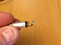 Also den Kopfhörer konnte ich öffnen: Grün und Gold ist angelötet, allerdings zusätzlich zu Grün auch dieser weisse Nylonfaden. Das kann ja wohl kein Leiter sein!???