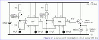 ... Die Schaltung besteht nun aus zwei NE555 (Du kannst auch den NE556 einsetzen, der beinhaltet 2 NE555). Mit dem ersten stellst Du die Impulslänge ein, mit dem zweiten kannst Du die Pausenlänge variieren.