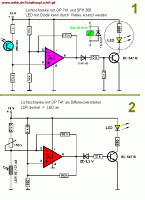 Möchtest Du die zweite Schaltung bauen, kannst Du auch wieder ein Relais mit Freilaufdiode wie oben einbauen. Bei der unteren Schaltung sollte die LED leuchten, wenn der LDR beleuchtet wird.