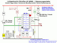 Soweit klar, aber ich brauch gerade einen Dämmerungsschalter. Und zwar einen, der mir einen NE555 auf Monoflop triggert. Also hab ich das gleich mit einem NE556 gemacht. Zeichnung unten.