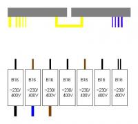 an der schiene ist ein ganz dickes gelbes, 2 3mm dicke, und 2mm dicke. auf der andern seite 4 blaue, davon 2 3mm dick, 2 2mm dick. beide seiten sind mit einem ganz dicken gelben kabel verbunden (??, sieht zumindest so aus, sonst ist dieses kabel sinnlos)