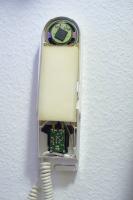 Der (sehr leise) Klingelton selber scheint aus dem Hörer zu kommen und nicht aus dem Gerät, das an der Wand hängt, obwohl dort im oberen Bereich seitlich Schlitze drin sind und es somit aussieht, als könnte dahinter sowas wie ein Lautsprecher sein. Ich hab das Gerät noch nicht aufgemacht, da alles irgendwie verclipst ist und ich das nicht gleich kaputt machen wollte. Probiert hab ich das natürlich. Ist aber widerspenstig. Eine Bedienungsanleitung hab ich leider nicht und ebenso wenig kenne ich die genaue Bezeichnung der Anlage.