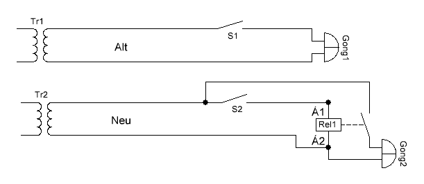 Damit liegt die Spule des Gong über den Kontakt parallel zum Relais und macht bei Öffnen des Schalters den Spannungsabfall an der Parallelschaltung niederohmig, wodurch ich hoffe, dass das Relais sicher abfällt.
