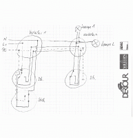 Ich habe mich nun durch alle infragekommenden Dosen gequält und darf vermelden, es handelt sich um eine klassische Wechselschaltung (die Qualität der Schaltungsskizze bitte ich zu entschuldigen ). Demnach muss ich nur in der Verteilerdose 2 den Lampendraht nochmal zurück zu einem Wechselschalter führen um eine dritte Lampe zu integrieren. Sozusagen eine parallel arbeitende zweite Wechselschaltung oder?