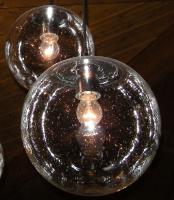 In der Mitte sind 5 Gruppen mit je 6 Glaskugeln montiert. Aussenrum sind weitere 6 Gruppen mit je 3Kugeln montiert. Insgesamt sind im Saal also 48 Leuchten montiert.