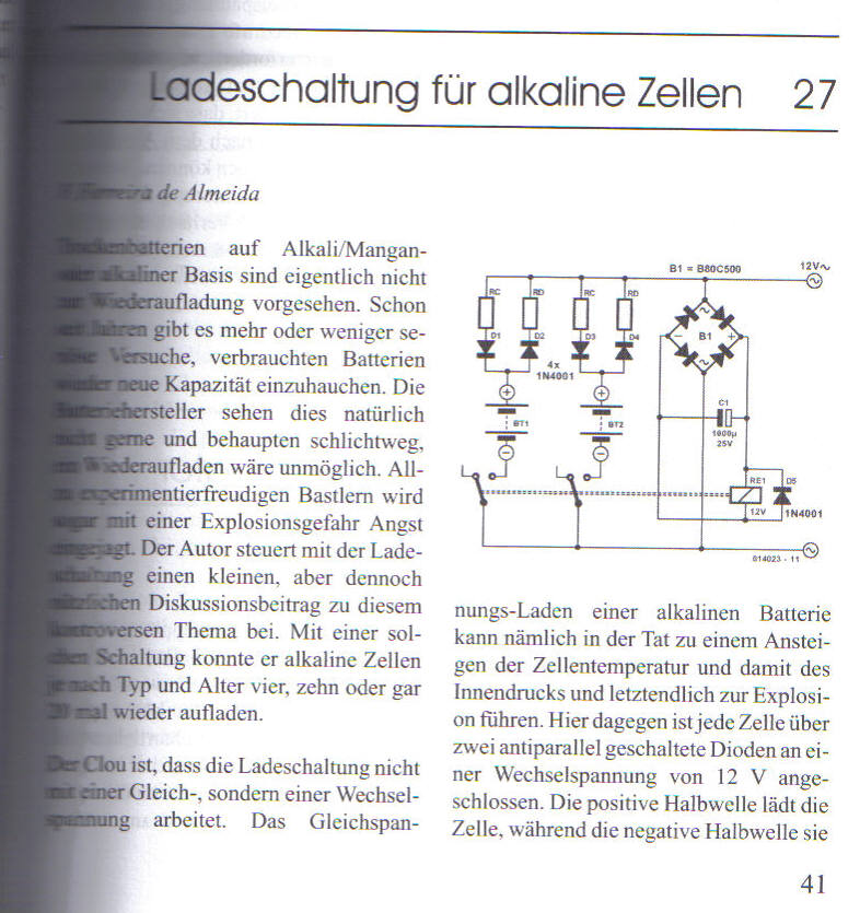Ich hatte im Nachlass meiner Schwiegermutter ein Ladegerät gefunden, mit welchem man angeblich auch Alkaline Batterien aufladen können sollte. Der Lader landete erst mal im Schrank, bis ich gestern wieder zufällig darauf aufmerksam wurde. Ich hielt die Aussage für großen Blödsinn, aber die Neugier war stärker; also habe ich gestern mal einen 9V Block in das Ladegerät gesteckt, der noch 7,1V laut Messung hatte. Was soll ich sagen; als ich diesen heute aus dem Ladegerät nahm, hatte er zu meiner Überaschung 9,4V! Es scheint also doch irgendwie zu funktionieren. Jetzt stecken 4Stck 1,5V AA-Batterien drin und ich warte auf das Ergebnis.