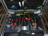 Hier mal ein paar Fotos von meinem Werkzeugkoffer. Der ist nur für meine Privaten Arbeiten gedacht. Was hier nicht im Bild ist: Ersa Multitip 25 Watt, Lötzinn und ein Proxxon Bit Satz. Der andere Proxxon Kasten ist ein Ratschensatz. In der Fluke Tasche befindet sich leider kein Fluke, sondern ein Spannungskraft VC960. Ein Hirschmann Kompressionsset und ein Sat Messgerät mit Spektrumanzeige gehört auch nich dazu. Was ich noch benötige ist ne Stromzange. Hammer, Stemmeisen usw nehme ich einfach in nen normalen Kübel mit.