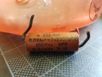 | | Diese Entstörkondensatoren sitzen im Anschlußgehäuse des Nähmaschinenmotors. | Der lesbare ist ein XY-Kondensator. Früher war der Schutzleiter "Erde" rot, jetzt ist er grün/gelb.