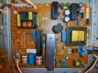 In Frage kommen für so ein Fehlerbild z.B. kalte Lötstellen im Inverterbereich, oder üblicherweise die Elkos, beides kann auch thermisch indiziert sein, wenn das Gerät warm wird tritt der Fehler auf, was zwar eher für kalte Lötstellen spricht aber auch defekte Elkos sind nicht auszuschließen.