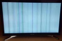 bei meinem Samsung-TV UE22F5470 tritt folgender Fehler auf: Es sind nach dem Anschalten schmale, farbige, senkrechte Streifen zu sehen. Ganz schwach sieht man reliefartig im Hintergrund das Fernsehbild, Ton höre ich keinen. Dazu - Bild 1.