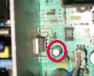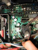 Im Bild gezeigten Elko ausbauen, Platine mit Spiritus und kleiner Bürste besonders bei den 2 IC's nebendran putzen (von oben).