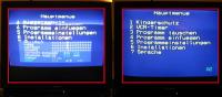 Als Anhang mal ein Bild davon, was der TV so anzeigt - das linke Bild ist direkt nach dem anschalten, Signal kommt über AV2 von einem Sat-Reciever, über Antenneneingang sieht's aber genauso aus; Das rechte Bild ist ca. 5(?) Minuten nach dem Anschalten entstanden - der gestauchte Bereich liegt jetzt oben in der "Hauptmenue" Schrift, insg. ist das Bild aber immernoch zu weit oben und leicht deformiert - das rote Rechteck soll jeweils den (sichtbaren) Rand der Bildröhre darstellen (ist sonst auf den Fotos nicht so gut zu erkennen)
