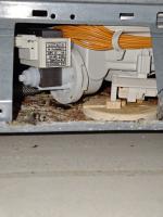 - Maschine auf den Rücken legen und die Bodenwanne entfernen. Dann die Schrauben für den rechten Sockel abnehmen, so dass er leicht nach rechts bewegt werden kann.