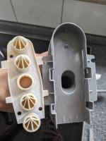 Dieser Schiebemechanismus ist nun aber etwas schwergängig. Gründe dafür stechen mir nicht ins Auge. Ich sehe weder bei dem Zuführrohr noch dem Schiebemechanismus nennnenswerten Kalkablagerungen oder so (siehe Bilder).
