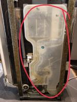 Um an die Spülpumpe zu kommen, musste ich die Spülmaschine auf die Seite legen und die Bodenplatte demontieren. Dabei ist eine Flüssigkeit ausgetreten. Sie stammt zu 99% aus dem auf dem Fotos rot markiertem Gefäss. Ist das soweit unkritisch, sodass ich die Maschine wieder anschmeißen kann? Es roch zumindest wie normales Spülmaschinenwasser (siehe rot markiert bei den Fotos).
