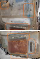 Der Salzbehälter (ebenfalls in der Wassertasche) hatt an einigen Stellen sehr unappetitlich aussehende Ablagerungen oder Wucherungen oder Verkeimungen. An einigen Stellen konnte ich mit zwei Magneten (einer innen und einer außen) den "Rotz" größtenteils abkratzen, der Grind befindet sich nun im gefluteten Salzvorrat. An andere Stellen (nach den gelbbraunen Kugeln [Enthärtersystem?]), ist es aber unmöglich ranzukommen.