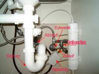 Ich hab mal ein Bild von meiner Küche gemacht und beschriftet. So sieht sowas normalerweise aus, Zulaufschlauch am Eckventil, Ablaufschlauch am Siphon.