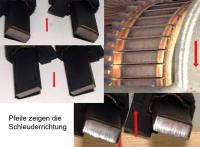 Okay, zurück zum Thema. Was sagst du zum Zustand der Kohlen und des Kollektors? So wie das aussieht, hat es starkes Bürstenfeuer gegeben (besonders beim Schleudern - siehe Richtungspfeile), was direkt nach Einbau des Motors nicht der Fall war, obwohl er da auch schon unter den o.a. Umständen "gesägt" hat. Ich befürchte, wenn ich den Motor so wie jetzt weiter betreibe, mutiert der Kollektor in kürzester Zeit zu einem runden Vieleck...