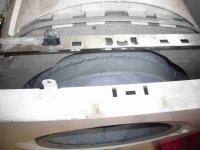 Lös den Spanndraht vorn am Faltenbalg und knöpf ihn aus der Vorderwand heraus. Lös auch die Türverriegelung. Der Faltenbalg kann am Bottich bleiben. Das Lager wird komplett mit der Bottichhälfte gewechselt.
