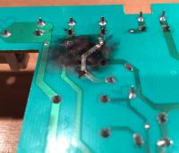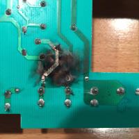 Was mich wundert sind die Schmauchspratzer um das Kontaktierpad (Bild 4, Lötpad im verkokelten Bereich unten rechts). Die Platine sieht für mich nach Single-Layer aus und an dieser Stelle ist auf der Bestückungsseite nichts. Vielleicht ist es aber auch gar kein Pad, sondern nur eine blanke Stelle. Ich entferne glaube ich mal die Schmauchspuren und machen weitere Fotos.