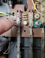 Trying to remove the front panel in order to access 4 differents pots in deep need of a clean, as the scratch too much when actioned, I had to face the problem of not understanding how to deal with a row of 8 mechanical buttons, whose function is to switch between stereo/mono, select radio band, mute, and so on. In the picture below you can see that there is an "arm" that connects the external physical button to a "boxed" end that makes the contact with the proper combination of "pins" for each arm.