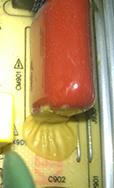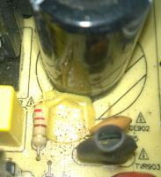 Gedanken solltest du dir eher um den am Rand versehentlich mit fotografierten Varistor an der Position TVR903 machen. Der ist nämlich deutlich sichtbar explodiert und die Brandspuren sind auch zu sehen.
