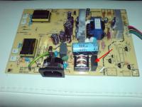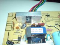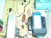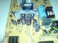Hat das "grüne Bauteil" neben dem Kaltgerätestecker (RT001) links unten ein ausgebranntes Loch? PRÜFE das zuerst! Dann löte den NETZGLEICHRICHTER aus und messe ihn!