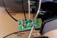Jetzt glaube ich, dass der Schwarze Draht vom Solarpanel an Pin 3 muss und Plus (Weiß) von der LED an Pin 1 und der Schwarze der LED irgendwo an Minus, also Pin 2.