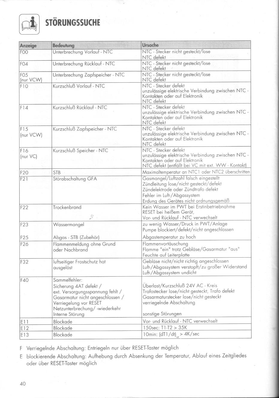 meine Gastherme Vailant VC 196E heizt nicht mehr und hängt sich auch nach einem Reset immer mit dem Fehler F20, F40 oder E13 auf. Die Fehlerliste