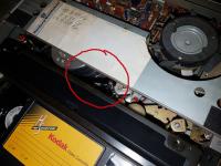 Ich kann eine Kassette einlegen und der Recorder zieht das Band mit einem rechten "loading arm" bis an die Kopftrommel ran (siehe Bild), aber nichts weiter passiert. Ausserdem wird die Kopftrommel beim Auswerfen der Kassette kurz in Bewegung versetzt.