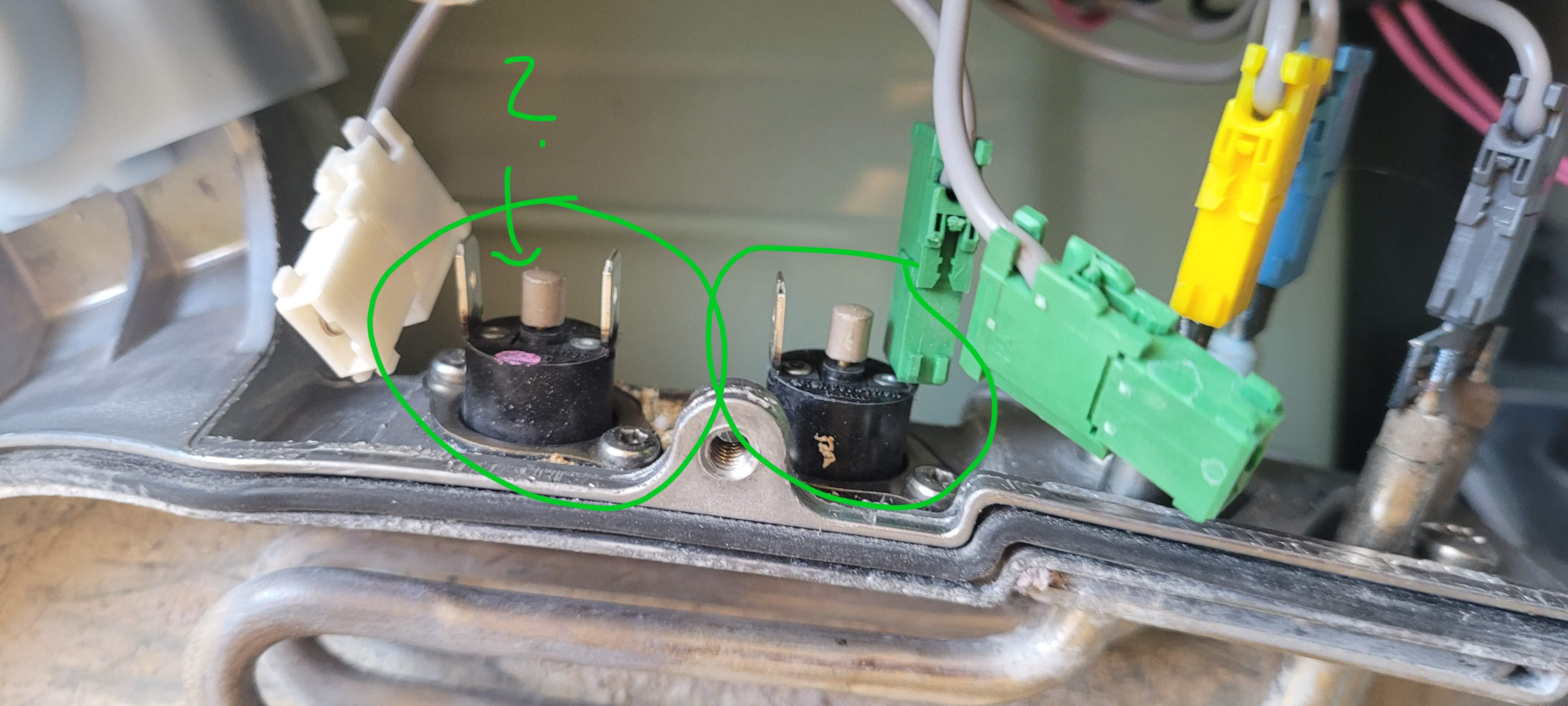Bin mir jetzt ziemlich sicher, diese Temperaturbegrenzer oder Klixon gefunden zu haben, direkt beim Heizstab.
