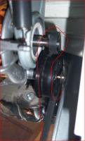 Der Drehpunkt ist das Motorlager, d.h. der Riemen spannt sich durch Verdrehen des Motors, so wie die Feder jetzt hängt, würde es nie funktionieren, da die Spannrolle vom Riemen weggezogen wird. Wo die Feder eingehängt wird, ist auf den Fotos nicht sichtbar, könnte aber auch so ein Steg am Motorgehäuse sein, wie auf den Fotos sichtbar (nur 180° weiter). Ganz genau kann ich es auch nicht sagen, in meinen Aufzeichnungen ist da eine etwas andere Mechanik (Spannrolle mit Hebel) abgebildet.