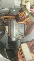 Oben links, hinten in der Maschine (von Vorne gesehen) ist ein breiter geriffelter Schlauch der sich samt Klemme gelöst hat - Wasser kommt in groben Mengen herraus wenn angeschaltet.