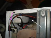 Mit „Ausgleichsbehälter“ meine ich das weiße Kunststoffgefäß im Abwasserstrang (siehe Foto) – könnte ein Syphon sein. Das Abwasser kommt von der Laugenpumpe (weißer Pfeil) und rinnt auf der anderen Seite (lila Pfeil) in den Abwasserschlauch.