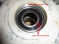 Die Lager sind auch nicht direkt in das Plastik eingesetzt, sondern da ist eine offenbar mit dem Bottich vergossene Hülse, in der die Lager stecken. Die scheint aus Alu zu sein, zumindest unterscheidet es sich farblich deutlich von den Lagerschalen.