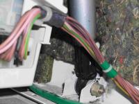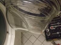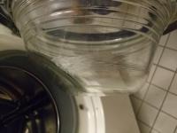 Bei genaueren Hinsehen, fiel mir auf, das der Bottich durch eine starke Unwucht hinten links (von oben betrachtet) einen weißen Kunstoffkasten beschädigt hatte. Dadurch lief beim Abpumpen Wasser daneben. Diesen Kasten konnte ich wieder abdichten.