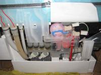 Nachdem in letzter Zeit das Geschirr teilweise nicht mehr richtig sauber wurde und das Wasser nicht mehr richtig aus der Maschine abgepumpt wurde, haben wir den Wärmetauscher/Wassertasche an der linken Seite des Geschirrspülers getauscht. Die Kammern des alten Wäremtauschers waren besonders im linken oberen Eck sehr verdreckt.