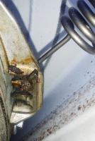 Wichtiger ist zu schauen, ob die Kunststoffunterlage unter den Federhaken am emillierten Gehäuse nicht durchgescheuert ist, weil sonst reibt der Federhaken an der Aufhängung im emaillierten Korpus