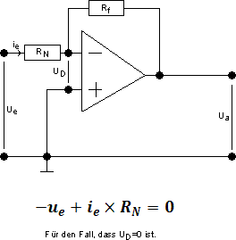Der OP will seinen Ausgang immer so regeln, dass zwischen seinen Eingängen 0V Spannungsdifferenz herrscht. Angenommen Rf und Rn sind gleich groß. Wenn jetzt am Eingang +1V anliegt, dann geht der OP-Ausgang auf -1V, somit liegt der Mittelpunkt des Spannungsteilers und auch der Invertierende Eingang auf 0V, genauso wie der Invertiernde Eingang, also deltaU = 0.