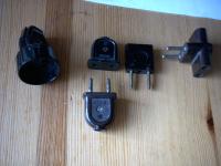 Erst der ältere flache Typ für 6A (mit dünneren Stiften) ohne alles und dann der jüngere runde Typ für 10A (mit dickeren Stiften). Jener dann schon mit Schutzkragen.