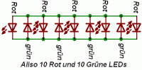 ICh möchte ca 10 rote LEDs und 10 grüne LEDs ansteurn sie sollen abwechslend auf blinken im ca. 10 sekunden tackt. Ich will Die LEDs do schalten, dass sie alle an einer Kette gereit sind ICh stelle mir das so vor wie im Bild