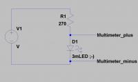 3mm LED grün (andere Bauart) zwischen Plus der Spannungsquelle und Widerstand 11.01 mA; zwischen Widerstand und LED 3,87V und 10,95 mA.