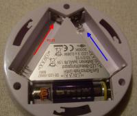 Diese LED-Lampe ohne Intelligenz gab es mal beim Lidl. Das Foto zeigt die modifizierte Rückseite mit den drei weißen LEDs. Der rastende Taster (mitte-rechts) wird von der anderen Seite bedient.