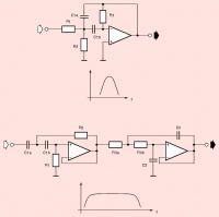 Meine Idee war, ob es nicht schon ein einfacher kombinierter Hoch- und Tiefpass (davon die untere Schaltung) zur Bandbegrenzung tut. Der Hochpass wird auf 500 Hz dimensioniert, der Tiefpass auf 2500 Hz. Das sind beides Filter 2. Ordnung, also beträgt die Flankensteilheit im Sperrbereich 12db/Oktave bzw. 20dB/Dekade. Jetzt musst du entscheiden, ob das ausreicht. Die berechneten Bauelementwerte sollten ziemlich genau eingehalten werden, aber ansonsten ist die Schaltung längst nicht so kritisch zu realisieren wie der hochgezüchtete Bandpass aus der Filter-Software.